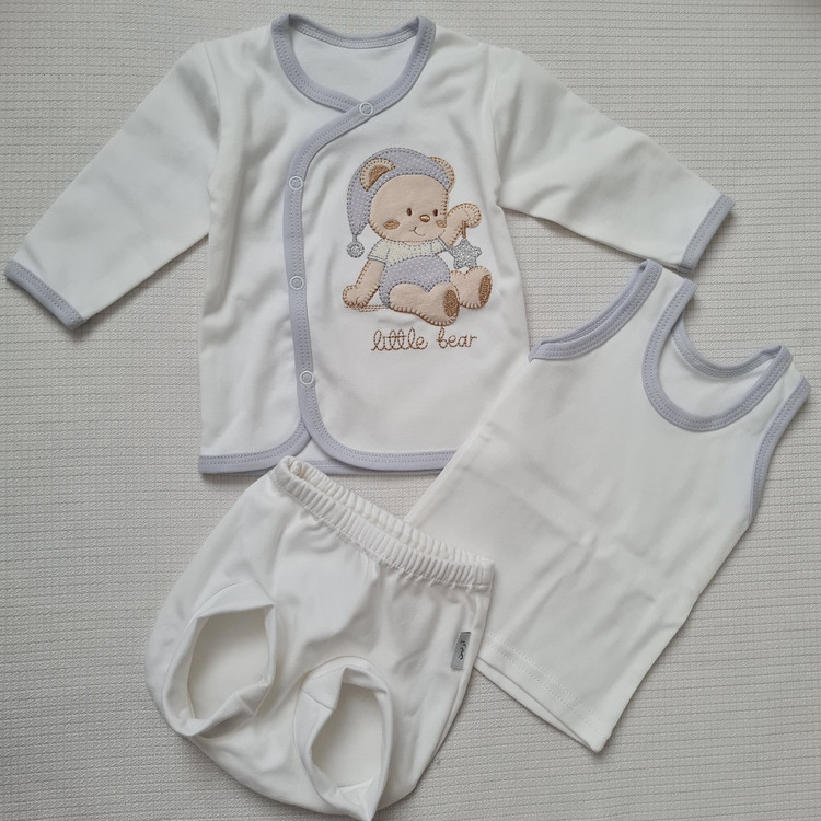 تکه های موجود در این بسته بندی: بلوز جلو دکمه، زیردکمه آستین کوتاه، شلوار، شورت عینکی، زیرپوش